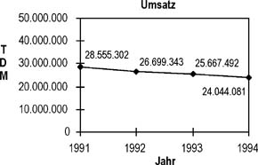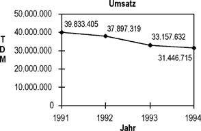 Die Textilindustrie erwirtschaftete Ende 1994 in 1131 Unternehmen mit mehr als 167.000 Beschäftigten einen Umsatz von 31,45 Mrd. DM (Bild 2-3 und Bild 2-4). Das waren insgesamt 16,2 % weniger Unternehmen, 41,7 % weniger Beschäftige und 21 % weniger Umsatz als 1991. Der Abwärtstrend bei den Beschäftigten setzte sich darüber hinaus fort, so daß 1998 in der statistisch neu gefaßten Branche knapp 129.000 Beschäftigte in 1081 Unternehmen einen Umsatz von etwas mehr als 35 Mrd. DM erwirtschafteten.