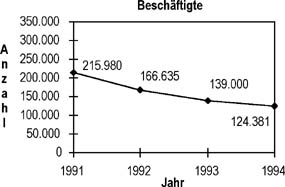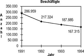 Beim Beschäftigungsabbau ist zu berücksichtigen, daß insbesondere noch 1991 in Ostdeutschland insgesamt ein großer Rückgang der Anzahl der Beschäftigten zu verzeichnen war. Weitere Ursachen für den unterschiedlich starken Rückgang des Umsatzes und der Beschäftigung sind in einer Produktivitätssteigerung und der Produktionsverlagerung in das Ausland zu suchen (vgl. Kapitel 2.5).