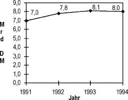 1Diese Werte dienen nur der Anschauung, da sie den Bekleidungskauf deutscher Einwohner im Ausland und von Ausländern in Deutschland vernachlässigen. Hinzu kommt die Einbeziehung der Kinder und Babys in die Bevölkerungszahl ohne Berücksichtigung der Ausgaben von 6,6 Mrd. DM für Baby- und Kinderbekleidung.