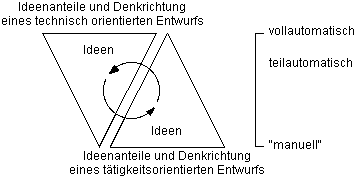 Zur Gestaltung von Mensch-Maschine-Systemen hat Ochterbeck (1989) die allgemeine Methode des Dualen Entwurfs entwickelt. Der Duale Entwurf hat zum Ziel, bei der Entwicklung von Mensch-Maschine-Systemen eine optimale Kombination zwischen technischen und tätigkeitsorientierten Lösungen zu finden. Hierzu werden zunächst Lösungsvarianten konzipiert und in das Schema nach Bild 4-2 eingeordnet. Anschließend wird in einem iterativen Prozeß, der durch die Pfeile angedeutet wird, die Lösung entwickelt.