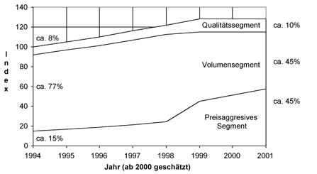 Neben der größer werdenden preissensitiven Gruppe gibt es weiterhin die Gruppe der sehr qualitätsbewußten Verbraucher, die auch bereit sind, entsprechend hohe Preise zu bezahlen. Sehr deutlich ist diese Entwicklung bei Pauschalreisen zu sehen, wie Bild 8-1 zahlenmäßig aus der Veranstaltersicht zeigt (Roland Berger 2000). Grundsätzlich ist diese Entwicklung auch auf den Bekleidungssektor übertragbar (vgl. NützelLange 2000).