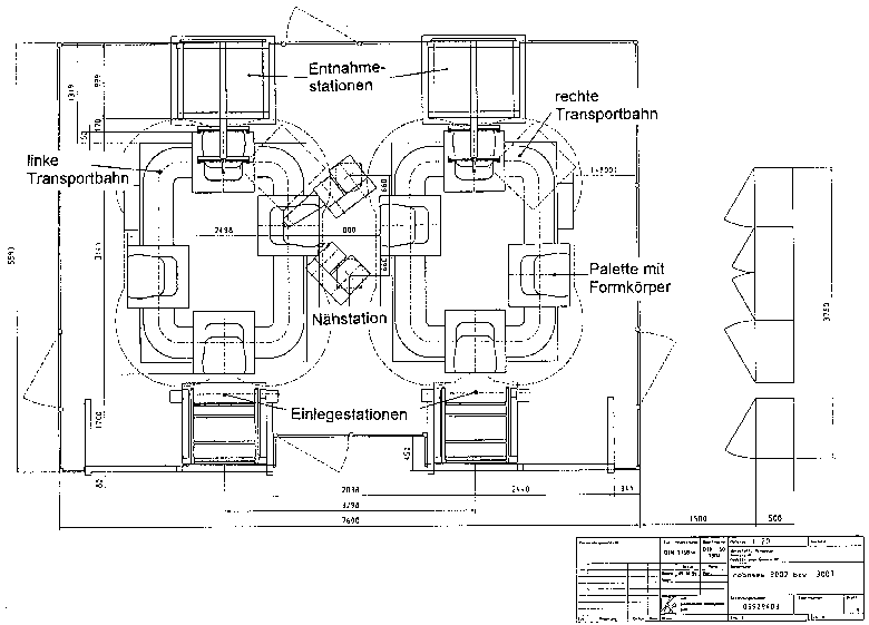 Bild 8-6: Zeichnung des Robosew 3002-Systems zur Fertigung von Autositzbezügen (Moll, Händler 1997)