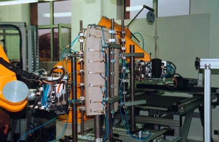 Schnellere Fertigung möglich: Die senkrechte Anordnung erlaubt einerseits die gleichzeitige Beschickung von Vorder- und Hinterrock und andererseits die überlappende Fertigung, d. h. die Integration der verfahrbaren Ausrichtstation in die Beschickungseinrichtung (Brozio 1999).