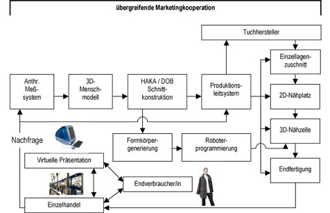 Die wesentliche Neuerung der nachfragegesteuerten integrierten textilen Kette ist der Fertigungsanstoß durch die Endverbraucherin und nicht mehr durch den Einkäufer des Einzelhandels. Daraus resultiert auch, daß die Kundin ihr Kleidungsstück nicht sofort mitnehmen kann, sondern auf die Lieferung warten muß. Eine hierzu im Auftrag des HDZ/IMA der RWTH Aachen durchgeführte Marktanalyse hat ergeben, daß 70 % aller Kundinnen und Kunden eine Lieferzeit von einer Woche oder mehr akzeptieren würden (Hennig u.a. 1998). Hierdurch wird eine schneller als bisher reagierende flexible Fertigung erforderlich, die eine perfekte Koordination über das gemeinsame Marketing hinaus zwischen den beteiligten Partnern erfordert. Hinzu kommt die Notwendigkeit einer kundennahen Fertigung zur Reduzierung der Transportzeiten, wodurch der Produktionsstandort Deutschland gestärkt wird.
