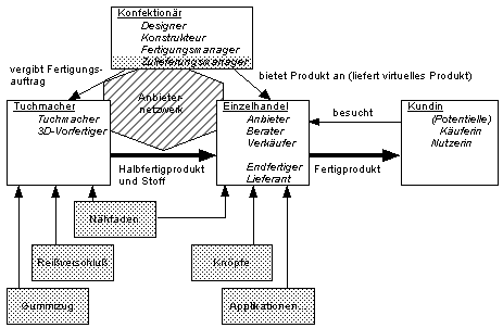 In dem Bild sind die vier Hauptakteure, d. h. die Netzwerkmitglieder und die Kundin, mit ihren Beziehungen und Funktionen dargestellt. Der Konfektionär entwirft und konstruiert die Produkte wie bisher und plaziert sich mit diesen am Markt. Neben dieser Kernkompetenz wird er verstärkt Fertigungs- und Zulieferungsmanager werden, indem er den Fertigungsauftrag (exklusiv) an den Tuchmacher und auch an die Händler vergibt. Zusätzlich beauftragt und koordiniert er als Zulieferungsmanager die Zulieferer mit ihren Produkten, d. h. den Nähfäden, Reißverschlüssen usw.